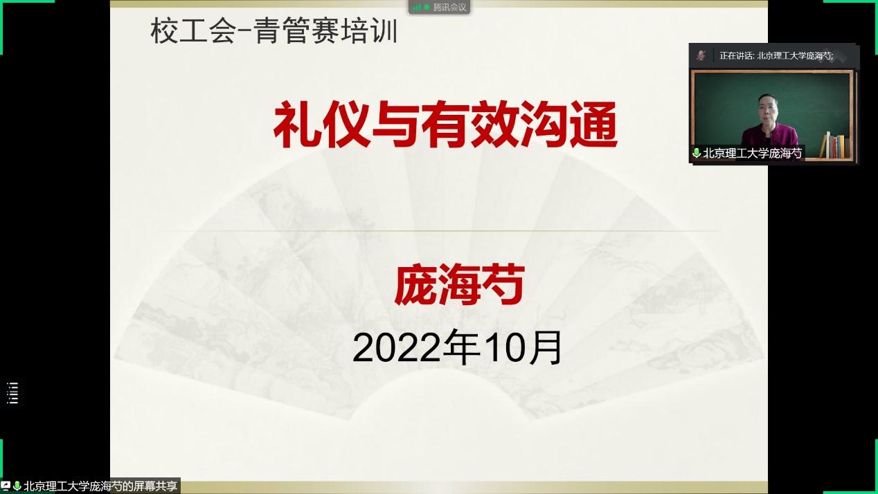 2022年10月26日,北京成人头条校工会与人文学院教学促进与教师发展研究中心(CELT)联合举办第七期青椒发展工作坊。CELT主任庞海芍研究员作“高校青年教师礼仪与有效沟通”专题培训。来自我校30余名即将参加管理岗位青年教职工职业能力竞赛的教师在线参加了学习,培训由校工会黄明福副主席主持。