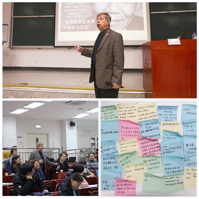 研讨会特邀马里兰大学卓越教学中心顾问Spencer Benson教授做了三场工作坊,主题分别为Can We Foster Student Motivation for Learning? Assessment of/for/as Learning: Strategies for Students and Courses Teaching as Research: Integrating SoTL into Your Teaching. Benson教授是美国教师发展、学习提升和课程评估与改革领域的领导者,他以启发式的教学互动,将美国“以学生为中心”的教育教学理念进行了深刻的讲解,引导参会教师对学生评价、教学学术研究、提升教学能力等多方面进行思考。每一场工作坊结束后,教师们都会将自己的所思所悟及想了解的更多问题写在便签中留下,Benson教授针对老师们的问题认真回应,亲身践行着学生中心的教学理念。